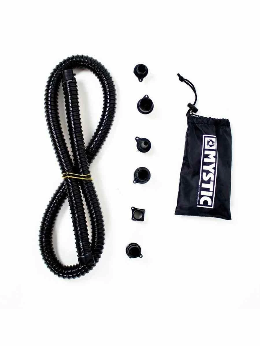 Wir liefern dir die Kite Pumpe komplett mit Tasche, Sechs Ventilen und flexiblem Schlauch.